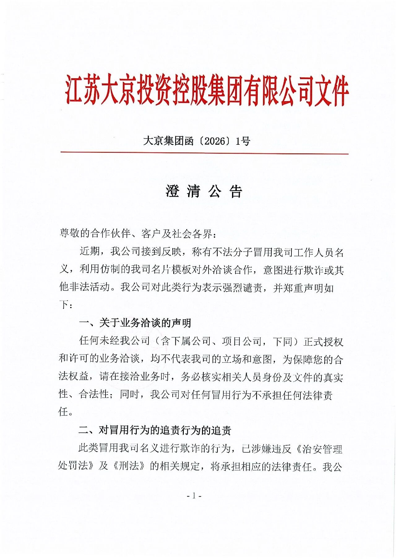 【澄清公告】警惕冒用江苏大京集团名义的欺诈行为