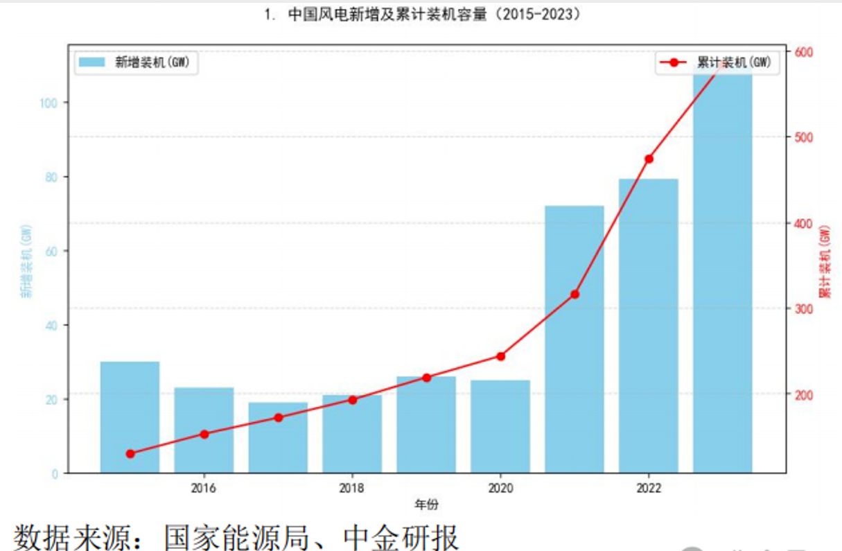 在全球能源转型和“双碳”目标的推动下,中国风电市场持续保持高速增长,2023 年新增装机容量达 79.37GW,同比增长59.30%,累计装机规模稳居全球首位。预计未来几年,中国风电市场仍将保持强劲增长,年均新增装机不低于 75GW,到2030 年有望突破 200GW。陆上风电凭借资源禀赋和政策支持占据主导地位,而海上风电在技术突破和规模化发展的推动下,正成为行业新的增长点。