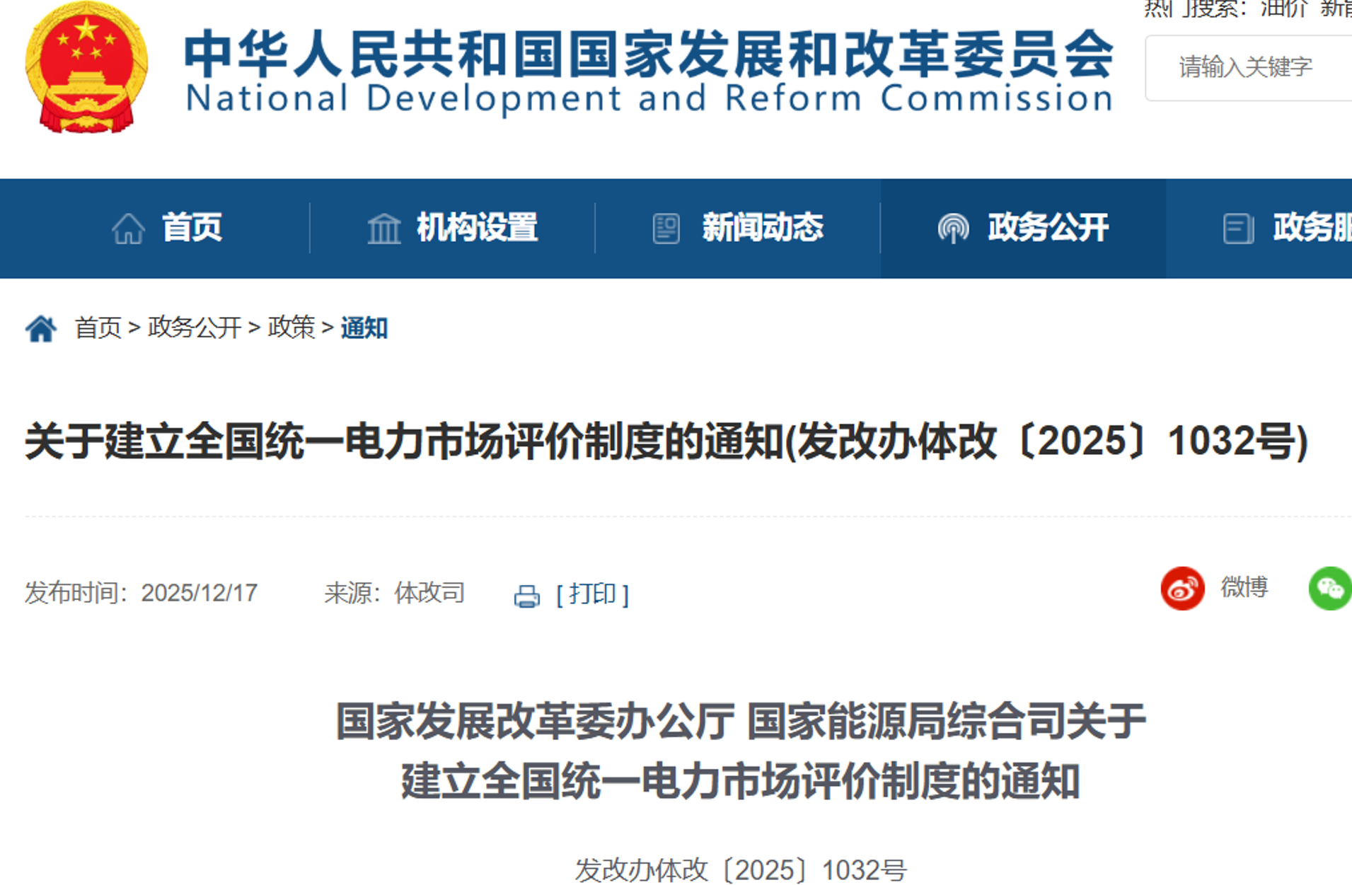 12月17日,国家发展改革委办公厅、国家能源局综合司发布关于建立全国统一电力市场评价制度的通知。