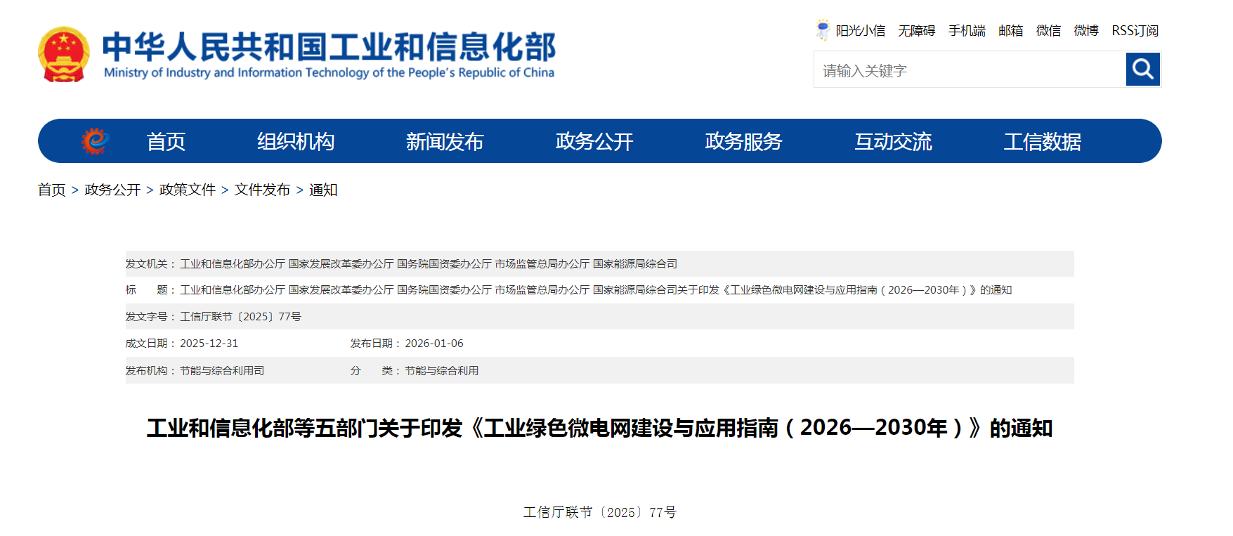 工业和信息化部等五部门关于印发《工业绿色微电网建设与应用指南(2026—2030年)》的通知