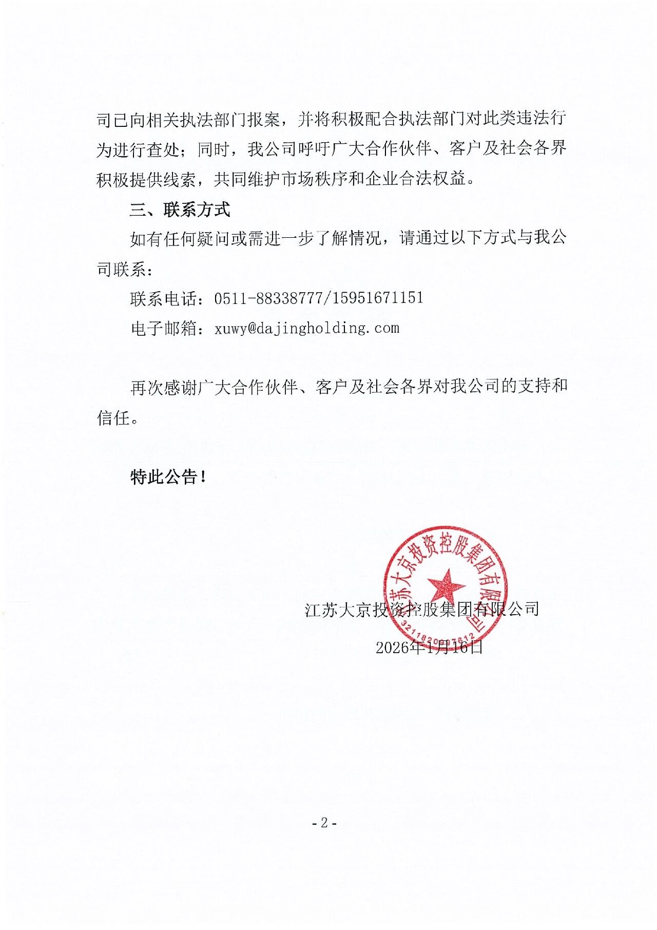 【澄清公告】警惕冒用江苏大京集团名义的欺诈行为